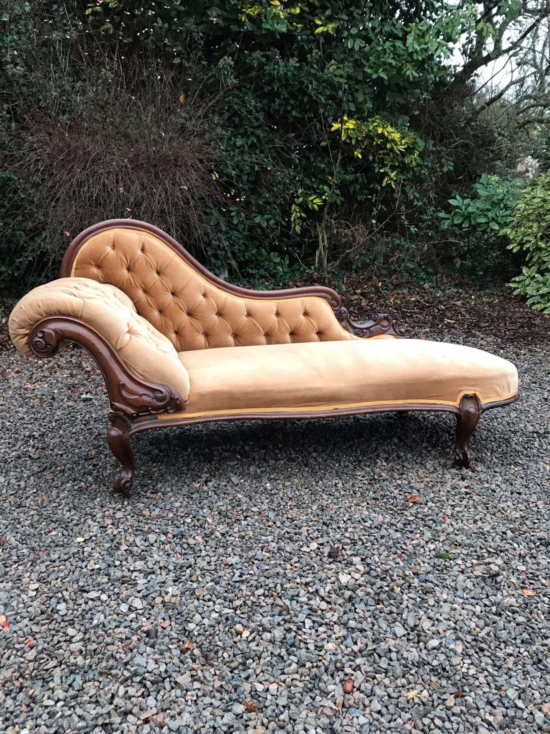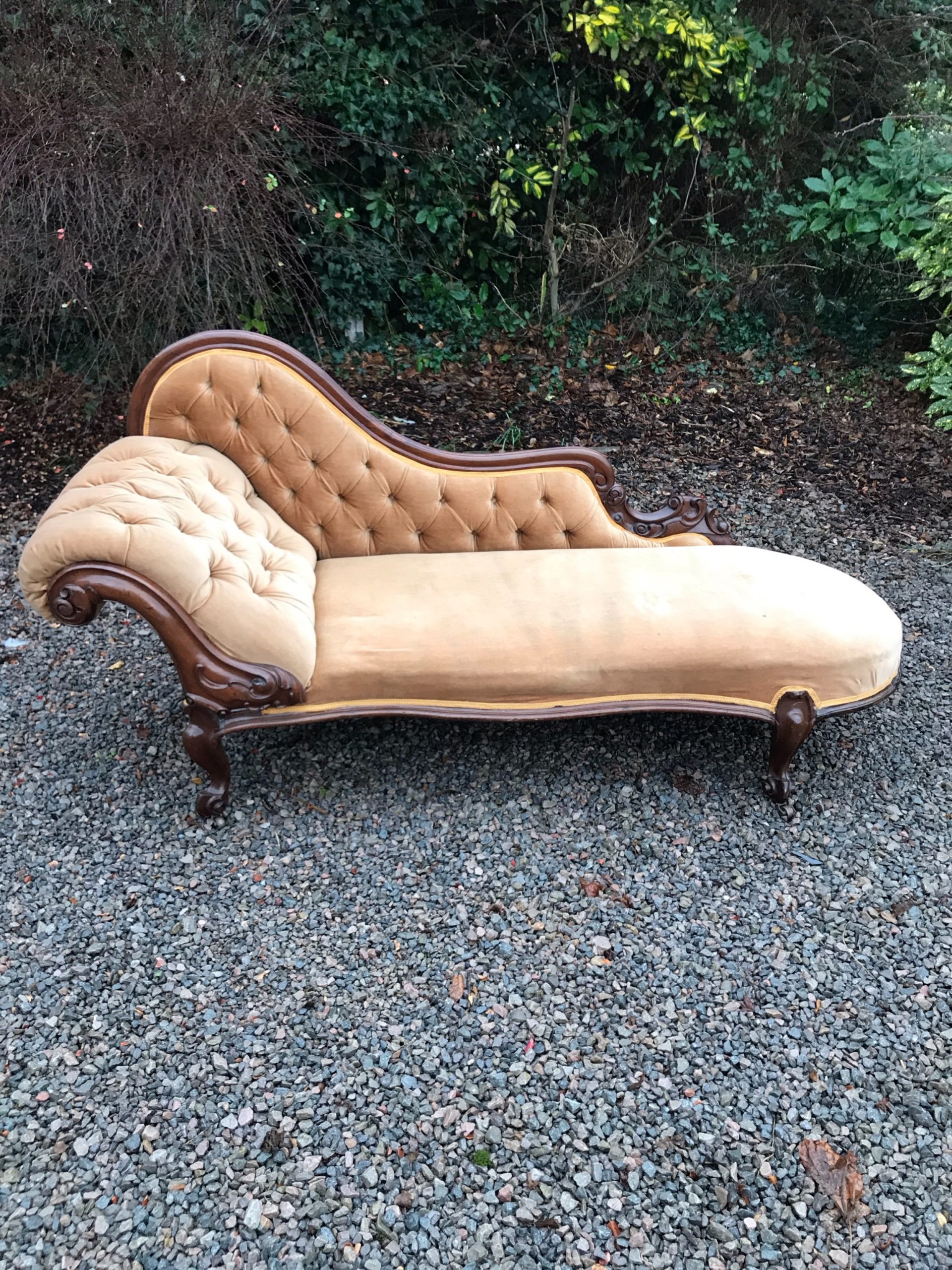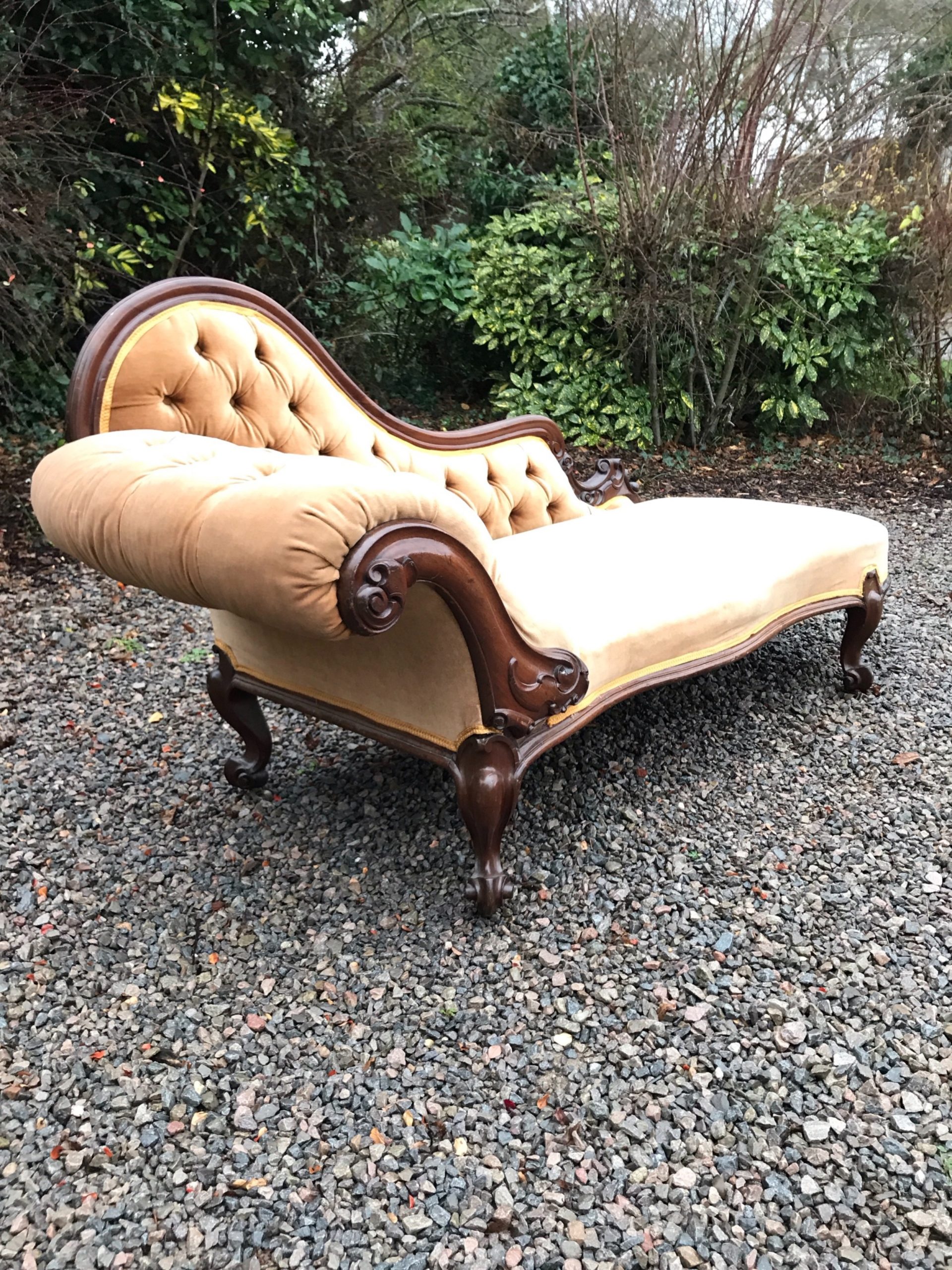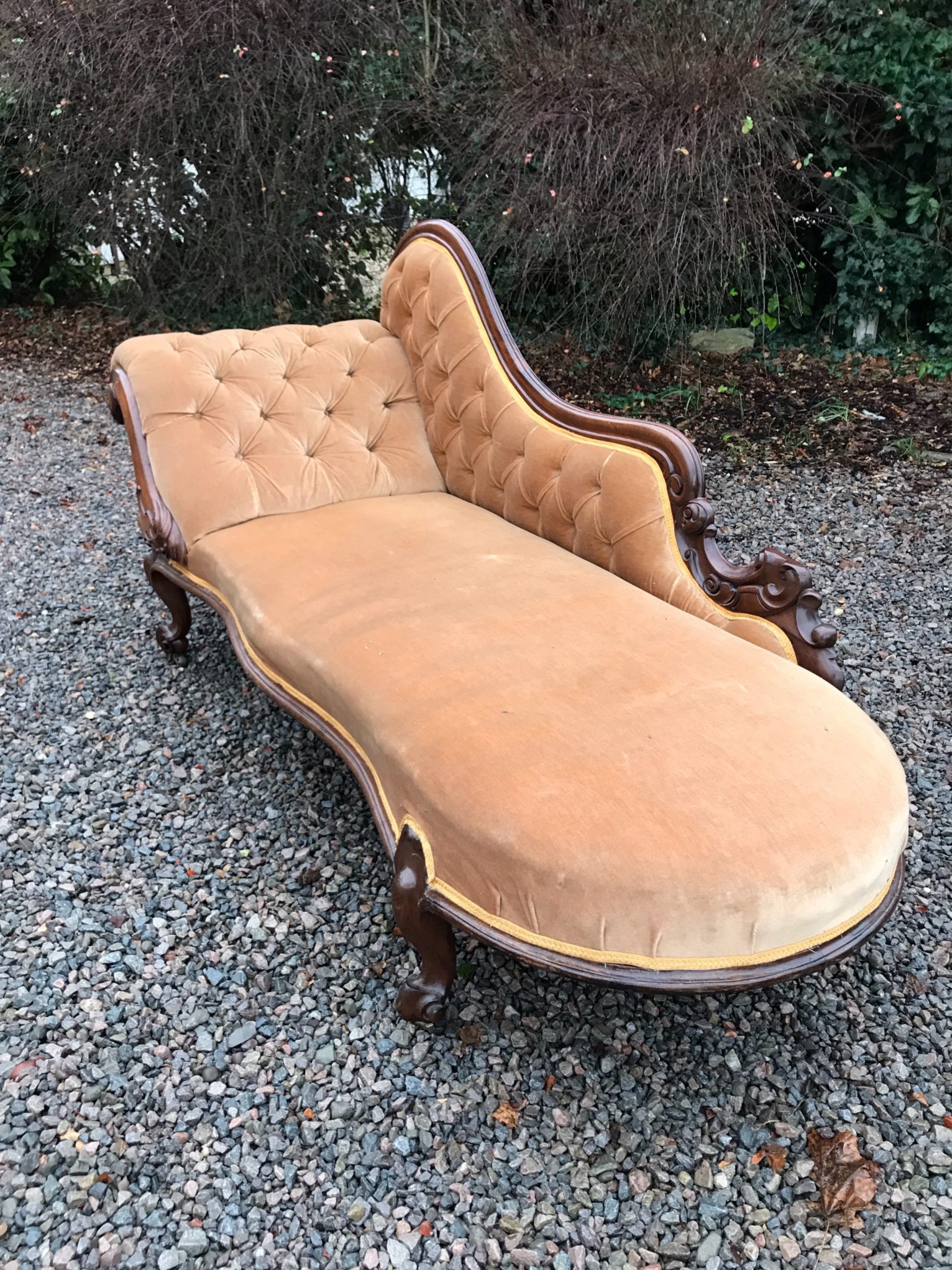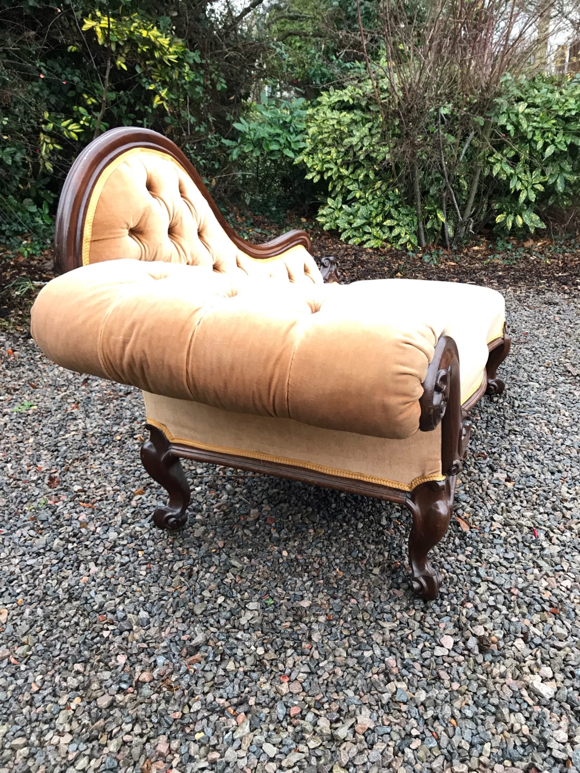The frame, back and legs of this chaise are completely original. There are nominal old use marks to the mahogany frame, which is commensurate with the age of this item. Importantly, the back rail and side arm are firm and there is no play in the joints. The draylon upholstery and braiding is clean and free of marks, dirt or tears. The springs in the seat are firm and in good condition. The four legs stand firm on the floor and the chaise does not wobble. Free of woodworm, solid in joint and ready to use.